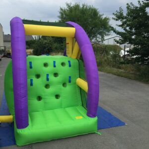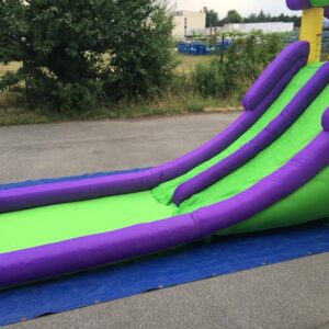 beeindruckende grün-violette Hüpfburg kombiniert Hüpfen und Rutschen mit einer spritzigen