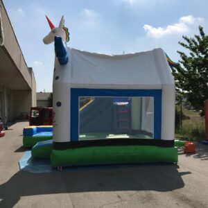 Einhorn gestaltet ist. Die Vorderseite der Hüpfburg hat einen großen Einhornkopf mit einem