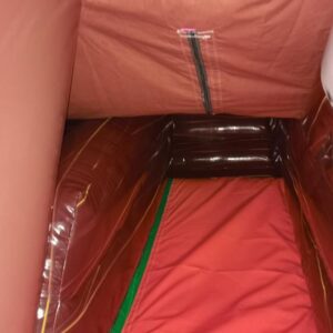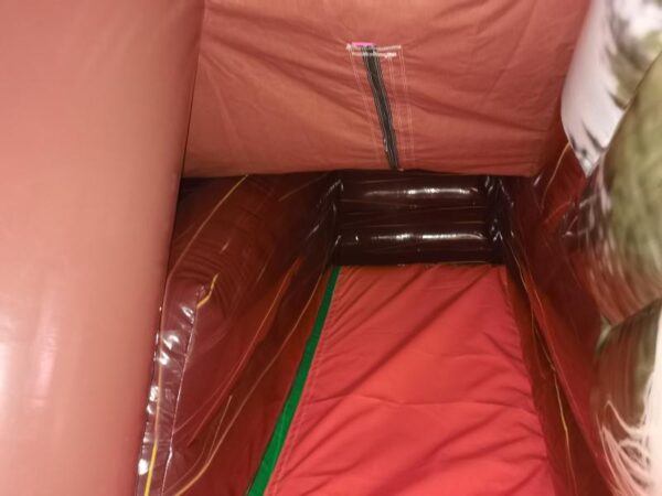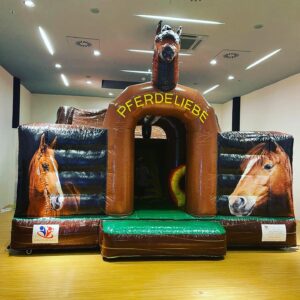 Die Hüpfburg „Pferdeliebe“ ist thematisch auf Pferde ausgerichtet. Sie hat eine braun-grüne Farbgebung und zeigt Bilder von Pferden auf den Seiten. Der Eingang ist ein großer Bogen mit der Aufschrift „Pferdeliebe“, über dem ein aufblasbarer Pferdekopf angebracht ist. Die Hüpfburg bietet eine Sprungfläche und ein kleines Klettergerüst im Inneren. Diese Hüpfburg ist ideal für Kinder, die Pferde lieben und gerne in einer thematisch passenden Umgebung spielen möchten.
