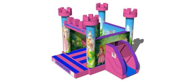 Die Hüpfburg “Princess” ist thematisch als Prinzessinnenschloss gestaltet. Sie hat vier Türme mit Zinnen an den Ecken, die ein Schloss nachahmen. Die Hauptfarben sind Rosa und Blau, was ein verspieltes und königliches Aussehen verleiht. Die Seitenwände und Türme sind mit Abbildungen von Prinzessinnen und einem Schloss dekoriert. Es gibt eine kleine Rutsche an der rechten Seite, die in das Design integriert ist. Diese Hüpfburg bietet viel Platz zum Springen und Spielen und ist ideal für kleine Prinzessinnen-Fans.